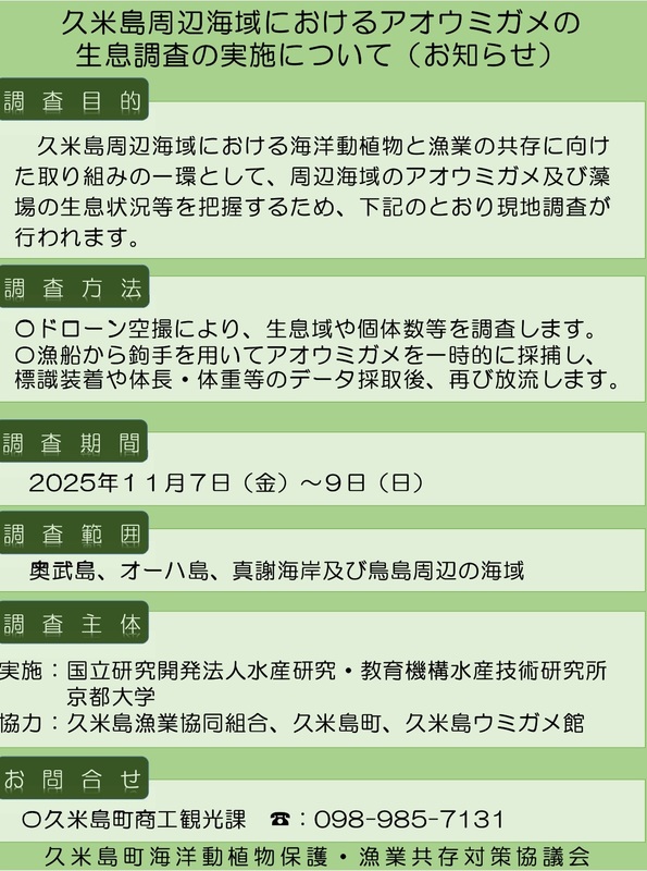 久米島周辺海域における海洋動植物と漁業の共存に向けた取り組みの一環として、周辺海域におけるアオウミガメ及び海藻藻場の生育状況等を把握するための現地調査が行われるのでお知らせします。