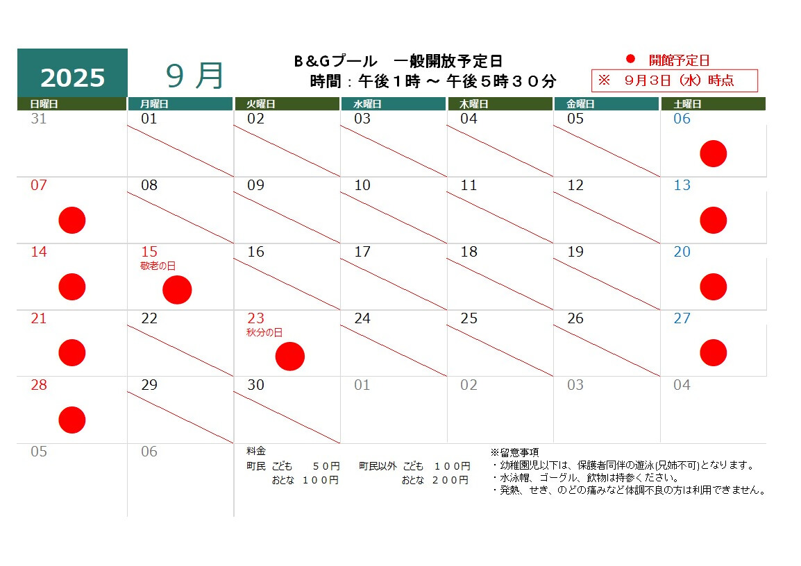 B&Gプール一般開放日程(予定)のお知らせ【R7.9.3更新】