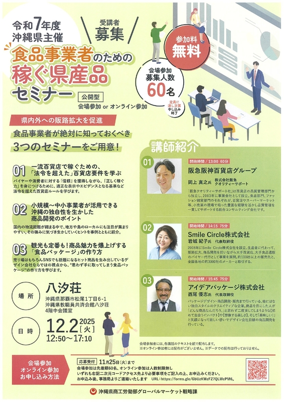食品事業者が絶対に知っておくべき3つのセミナーをご用意して、県内外への販路拡大を促進します。ぜひこの機会にご参加ください。