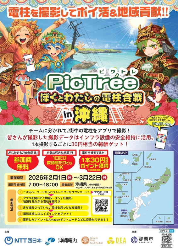 久米島町内の電柱を撮影してポイ活&地域貢献イベント「Pictree ぼくとわたしの電柱合戦in沖縄」を2026年2月1日(日) ~ 3月22日(日)の期間で行われます。アプリをダウンロードして、ぜひご参加ください。