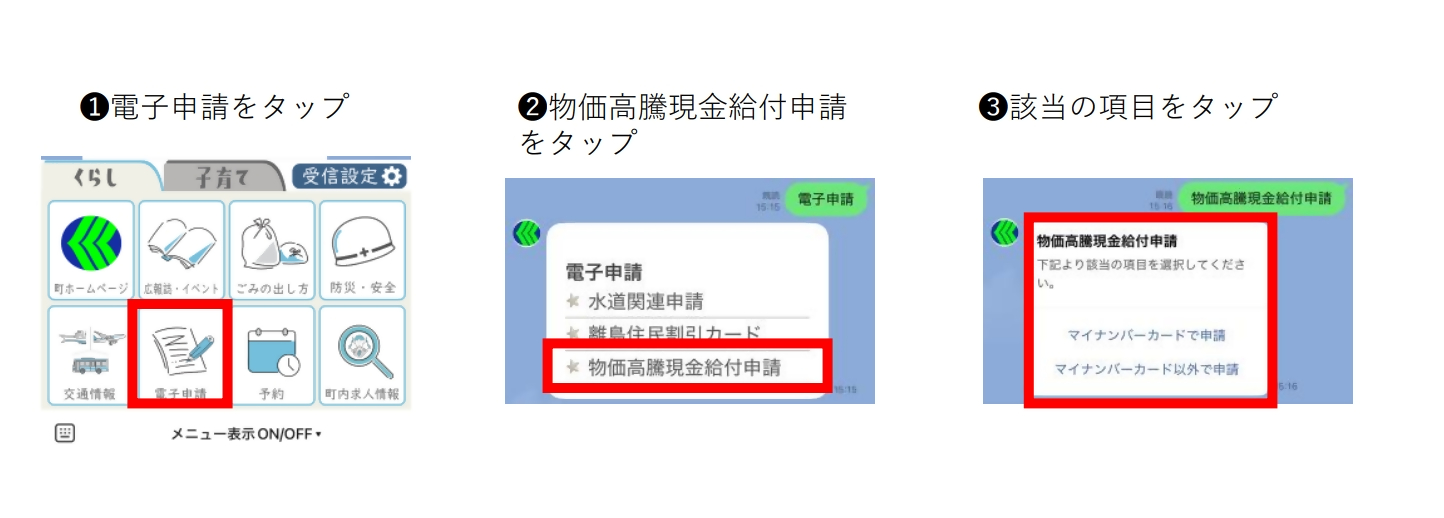 2.メニューの「くらし」、「電子申請」から「物価高騰現金給付申請」を選択し、利用する手続きを選択します。