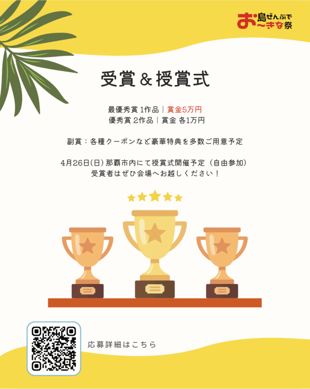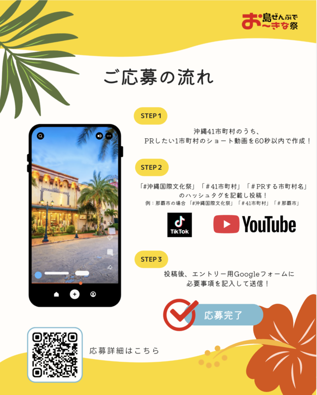 国際通りを中心にレッドカーペットやトークショー、音楽フェスなど沖縄の魅力を国内外に発信する春の一大イベントです。県内41市町村の魅力をショート動画にしてPRするコンテストも開催されます。風景、文化、伝統行事、特産品、観光スポット、人の魅力など、久米島ならではの魅力を映像を通して紹介してみませんか。