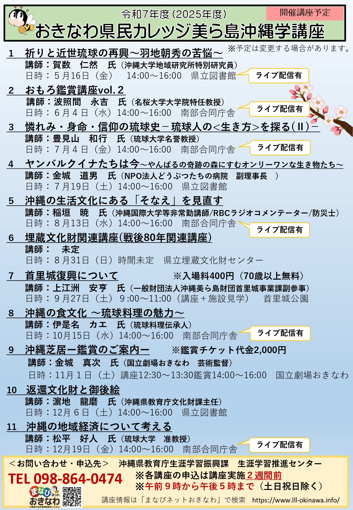 ![]() | 2024年10月25日(金曜日) | 令和7年度 沖縄県民カレッジ講座のご案内 |