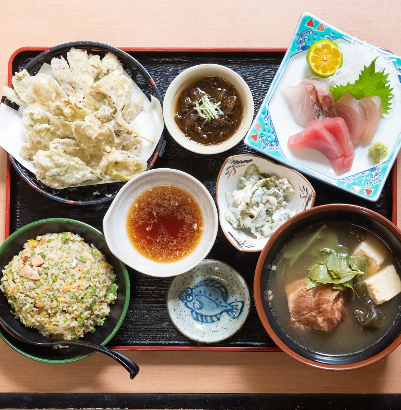 久米島の長命草「さくな」をふんだんに使った御膳。店主が自ら採った新鮮な刺身ともずくが彩る、体にやさしい久米島の恵みをまるごと味わえる一品です。