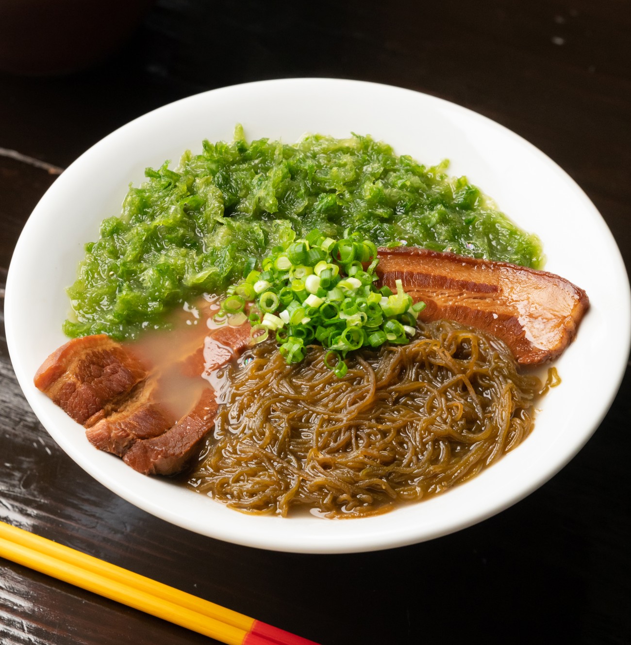 久米島で採れたたっぷりのアーサともずく、器からあふれる大きなとろとろ三枚肉。海洋深層水を練り込んだモチモチの麺と合わせ、久米島の海の恵みを存分に感じられる一杯です。